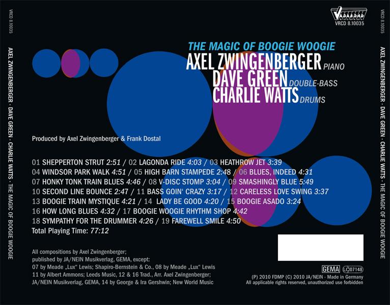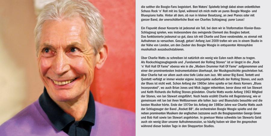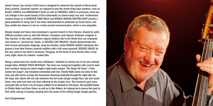 Axel Zwingenberger gibt im Jahr rund 200 Konzerte auf der ganzen Welt und ist eine Kapazität auf seinem Gebiet: Klavierspielen im Sinne der Originale des Boogie. Dies hatte auch Charlie Watts erreicht und so gründeten sie ein Trio mit dem bekannten Studiobasssten Dave Green zusammen. Es war natürlich eine Ehre für mich für diese Herren arbeiten zu dürfen.